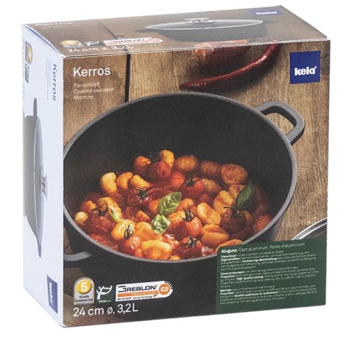 • materiál: tlakově litý hliník- vnitřní keramický povrch GREBLON C3+- průměr: 24 cm- výška: 10,5 cm- tloušťka stěny: 5 mm- objem: 3,2 l- skleněná poklice- vhodná pro všechny typy ohřevů včetně indukce- série: Kerros- značka: KELA- záruka 5 letKerros série je vyrobena ze silného litého hliníku s tloušťkou stěny 5 mm. Zvláštní znak kvality: 6 hvězdičkový nepřilnavý povrch GREBLON-C3+. 3-vrstvá, keramikou plněná teflonová vrstva se vyznačuje vynikající anti-adhezním efektem, vysokou odolností proti poškrábání a velmi dobrou odolností proti oděru.