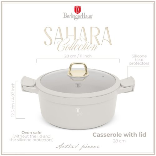 Elegantní kastrol z kolekce Sahara Collection s titanovým povrchem je ideálním pomocníkem pro každodenní vaření. S objemem 6,6 l a průměrem 28 cm je vhodný pro přípravu různých pokrmů. Skleněná poklice se silikonovým okrajem zajišťuje bezpečné vaření, zatímco odnímatelné silikonové rukojeti umožňují snadnou manipulaci. Kastrol je kompatibilní s indukčními, sklokeramickými, plynovými i elektrickými varnými deskami a je vhodný také pro použití v troubě.