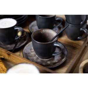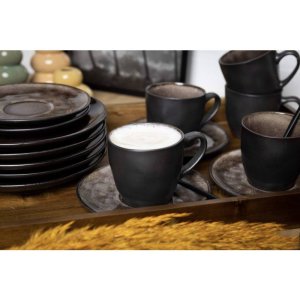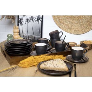 Tvrdé a přitom klidné nádobí? Pak je pro vás tato sada nádobí Cookinglife ideální! Tmavě hnědá barva překvapí vaše hosty. Upozornění: vnitřek nádobí není nikdy úplně stejný, díky čemuž je každý produkt z kolekce jedinečný. Jde o malé rozdíly, takže díly do sebe stále perfektně pasují. Kombinujte kávovou sadu s mísami z kolekce nebo ji zkombinujte s ostatními barvami Cookinglife Tableware.Kávový set se skládá z:6 šálků na kávu (kapacita 175 ml) 6 podšálků (14,5 cm) 6 dortových talířů (19 cm)