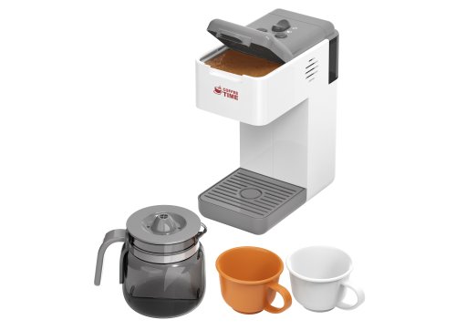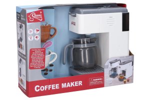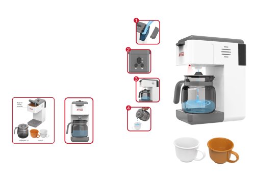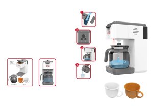 Kávovar s konvicí a tekoucí vodou. Rozměry 20x9x20cm. 2xAA baterie nejsou součástí. světelné a zvukové efekty. obsahuje kávovar, konvici a dva hrnečky. Po naplnění kávovaru vodou do nádržky nahoře vzadu kávovar napouští vodu do konvice. tlačítko on/off. Obrázkový návod na obalu.