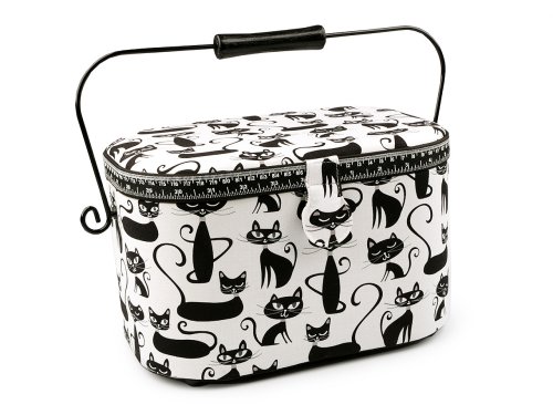 Košík na šicí potřeby s motivem koček nadchne nejen švadleny a pletařky, ale i další kreativní nadšence. Do čalouněného košíku se vejde plno šicích potřeb. Uvnitř se nachází praktické odnímatelné patro z průhledného plastu, které má 1 velkou a 6 malých přihrádek. Ve víku jsou 2 textilní kapsy a kulatý jehelníček. Košík se zapíná na magnetický patent, má kovové madlo s dřevěnou rukojetí na pohodlné přenášení. Dole jsou 4 nožičky ve tvaru kuliček.