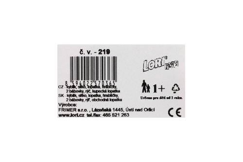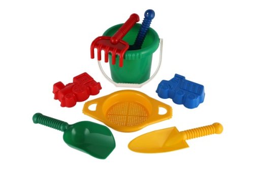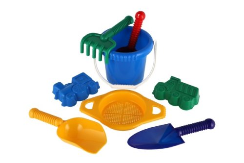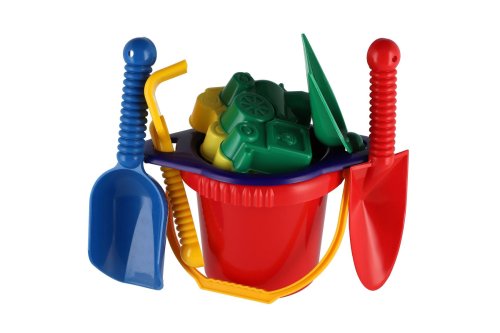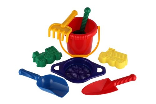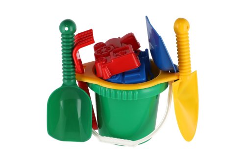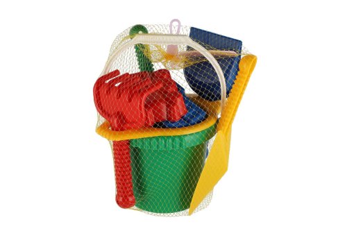 Plastová sada na písek. Sada obsahuje kbelík, sítko, lopatky, hrabičky a 2 bábovky. V síťce 20x28x12 cm. Vhodné od 12 měsíců.