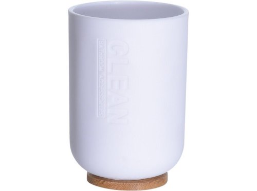 Elegantní kelímek do koupelny, na zubní kartáčky, pastu či jiné drobnosti. Kombinace plastového kelímku a bambusové podstavy.