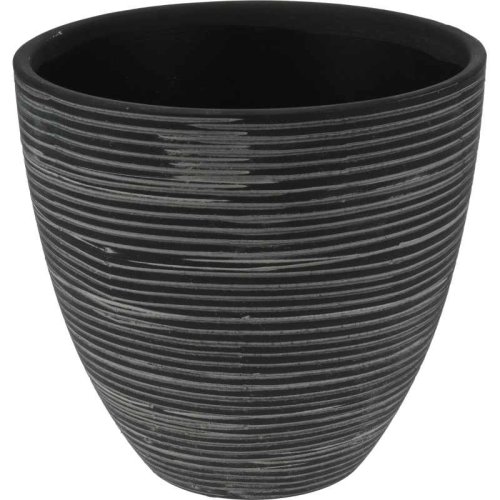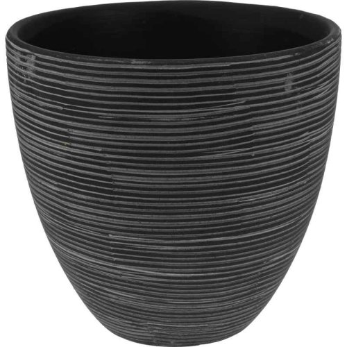 Moderní sada tří černých květináčů s elegantním designem a jemným vzorem tenkých řad. Ideální pro stylové aranžmá rostlin v interiéru i exteriéru.