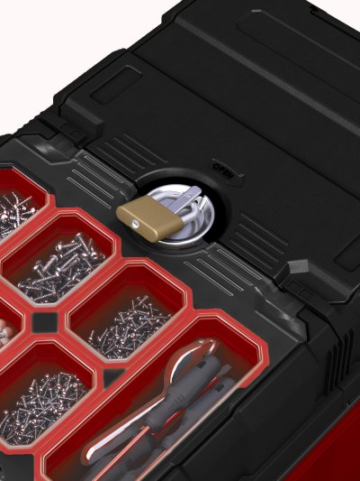 Výrobek má rozsáhlou skrýš, jejíž obsah je dokonale viditelný díky průhlednému víku. Nádoby na nářadí uvnitř skříně lze snadno vytahovat, což výrazně usnadňuje práci s v nich uloženými drobnými předměty, jako jsou šrouby, matky, hřebíky. Skříňka byla vyrobena z odolného plastu, který zaručuje její stálost a odolnost vůči mechanickému poškození.