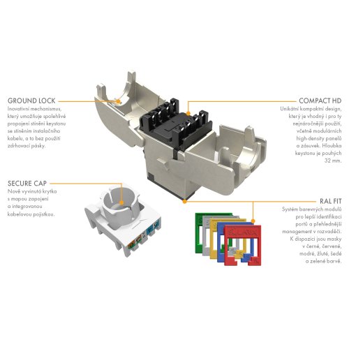 Díky 180° samořezné svorkovnici s barevným označením T568A/B je instalace rychlá a bez chyb. Modul je vhodný pro vodiče o velikosti AWG 26 až 22 a poskytuje stíněné připojení pro síťové aplikace do 1 Gbps. Díky své univerzální konstrukci se hodí do zásuvek většiny výrobců, a to bez nutnosti úprav. Odolnost proti opakovanému použití zajišťuje dlouhá životnost portu i svorkovnice.