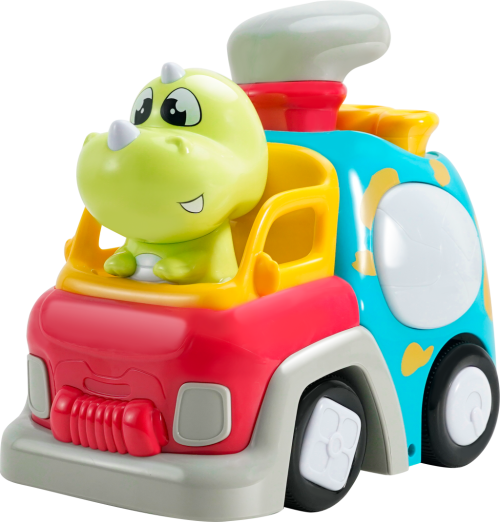 Zábavné Kiddy Go! autíčko s dinosaurem. Auto svítí a vydává zvuk po stisknutí tlačítek na zadní straně auta, auto vyžaduje baterie 3xAA, jsou součástí. Kolečka na volnoběh. Vhodné pro děti již od 18ti měsíců.