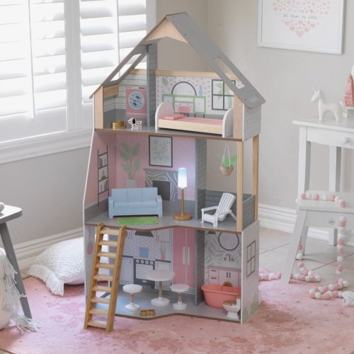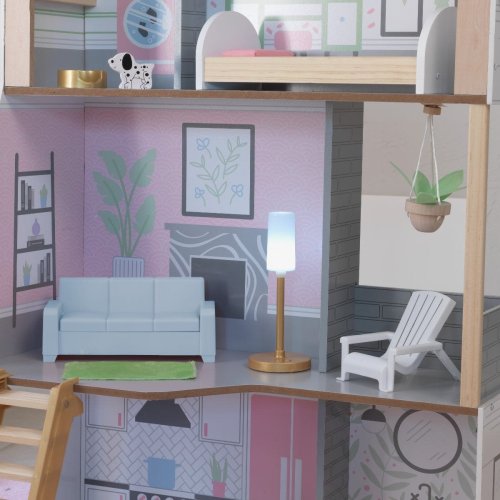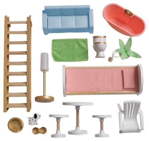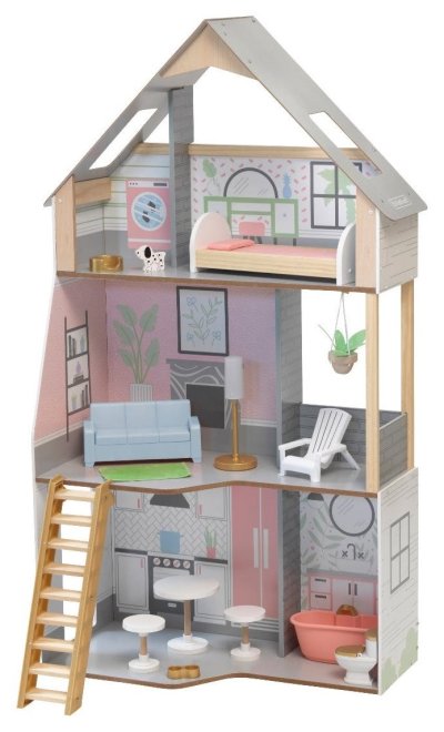 Dřevěný domeček pro panenky Alina je vzdušný a světlý. Je vhodný i do menších prostorů. Ve třech podlažích je vše, co je ke hře s panenkou potřeba. V přízemí se nachází prostorná kuchyně a kouplena, ve druhém je obyvák a veranda a v podkroví ložnice a druhá koupelna. Součástí domečku je 15 kusů nábytku a příslušenství.