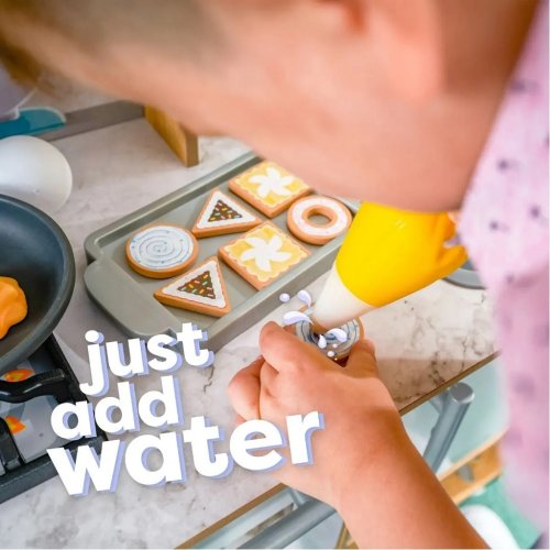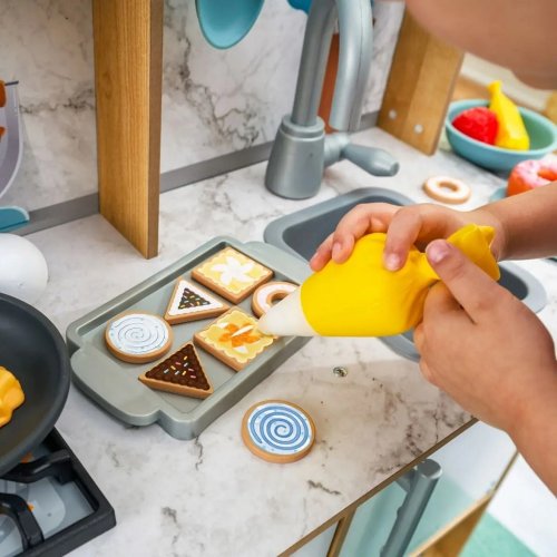 Efektivní kuchyňka Surprise Sweet z robustního dřeva nabízí nekonečné nápadité možnosti hraní. Za její pomoci můžete péct a zdobit nejrůznější dobroty! Pokud například naplníte zdobící sáček trochou vody a přiložíte jej na vrch sladkého pečiva budete svědky kouzla! Dříve bílý povrch ukáže svou skrytou barvu! Kuchyňka je dále opatřena úložnými prostory, praktickými kolíky pro úchyt náčiní, boční servírovací policí a umyvadlem s otočným kohoutkem. Hlavní vlastnosti: chladnička a trouba se snadno uchopitelnými rukojeťmiumyvadlo s otočným kohoutkemsada obsahuje 32 jídel, pánev, podnos a nádobí Dokumentace: návod k sestavení