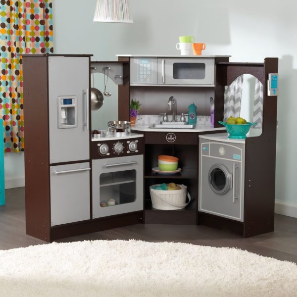 Prestižní cenou ověnčená kuchyňka, která Vaše děti uspořádáním a výbavou doonale obklopí. Zařízení čítá dřez, multifunkční sporák, lednici s dávkovačem ledu a mrazákem, mikrovlnnou troubu, pračku a na boku i bezdrátový telefon pro důležité hovory. Kuchyňské náčiní můžete uložit do jednoho z mnoha rozměrných úložných prostor, do police pod dřezem, či za plně funkční dvířka některého ze spotřebičů, hračky lze ale také zavěsit na háčky nad sporákem. Dvířka trouby jsou vybavena velkým průhledem, kterým můžete obdivovat nápaditost chystaných jídel. Řada prvků je interaktivní, knoflíky obsluhy otáčením vydávají cvakavé zvuky, další, jako dávkovač ledu a hořáky sporáku, jsou bateriově napájené a nabízejí zvukové a světelné efekty. Výrobek vyžaduje montáž, dodáváno s detailním návodem k sestavení. Hlavní vlastnosti:dřez, multifunkční sporák, mikrovlnná trouba, lednice s dávkovačem ledu, mrazák, pračka a telefonotevíratelná dvířkarozměrný úložný prostorsvětelné a zvukové efekty (9×LR44 baterie nejsou součástí balení)odolná konstrukce Ocenění hračky:Loved By Parents Platinum Award 2017