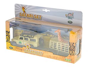 Hurá do Afriky na zebry a žirafy s bezpečným autem Land Rover Defender. Auto je kovové, 14cm dlouhé a na zpětný chod. Jeho součástí je odpojitelný přívěs o velikosti 14cm k přepravě zvířat.