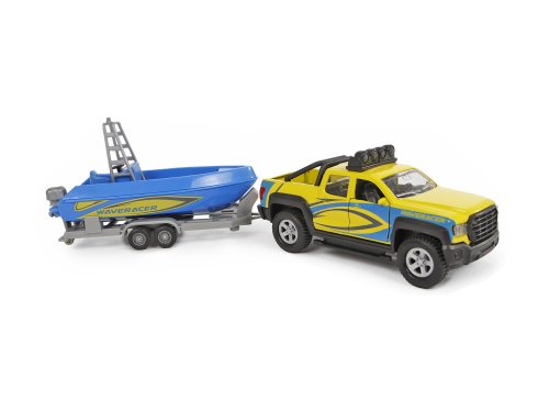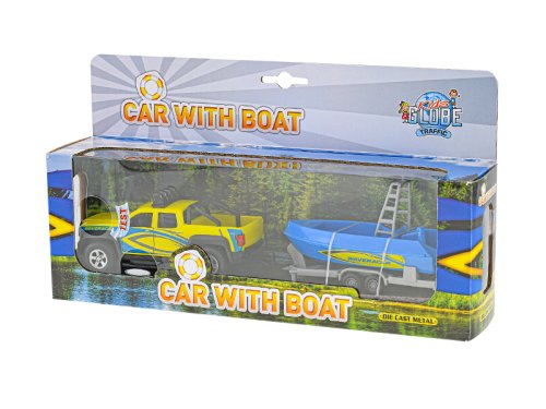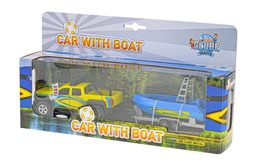Vyrazte za dobrodružstvím k vodě s úžasným terénním autem z kolekce Kids Globe Traffic. Kovové auto o velikosti 27 cm je na zpětný chod. Přední dveře lze otvírat. Tahač je na baterie, vydává zvuky a svítí. Za autem je přívěs s krásnou modrou lodí, se kterou jistě zažijete spoustu zábavy.