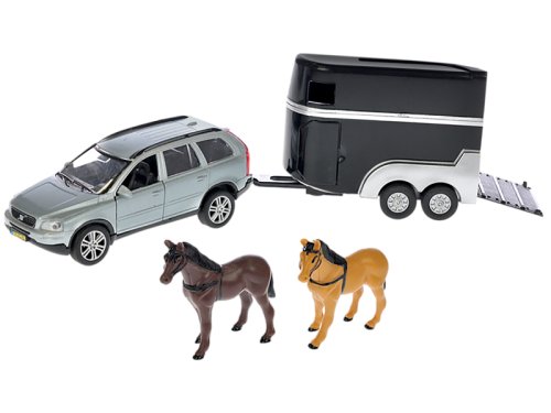 Kovové auto Volvo XC90 je součástí kolekce Kids Globe. Velikost auta je 14 cm a je na zpětný chod. Auto má otevíratelné přední dveře. Součástí je i kovový přívěs na koně, který má otvírací zadní dvířka a odjímatelnou střechu. V přívěsu se nachází dva plastoví koníci. Toto auto ocení milovníci aut i koní.