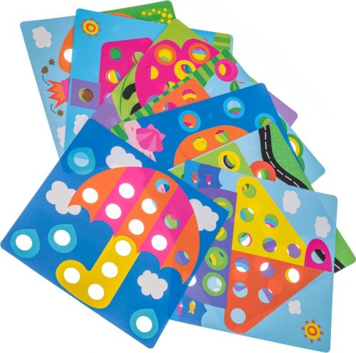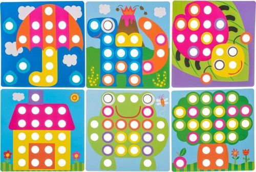 Tato vzdělávací barevná mozaika je ideální pomůckou při učení názvů barev a počítání. Cílem je umístit barevné kloboučky do otvorů na obrázkovém podkladu.