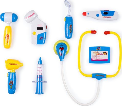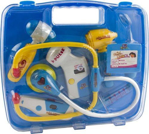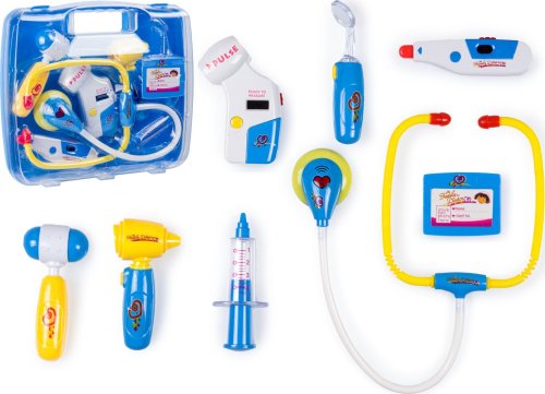 Pro všechny doktory a doktorky! Kufřík obsahuje všechny důležité zdravotnické pomůcky - stetoskop, teploměr, měřič krevního tlaku, přístroj na vyšetření uší, injekční stříkačku, kladívko, lékařský odznak a lékařské zrcátko. Některé doplňky jsou vybaveny zvukovými a světelnými efekty.