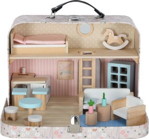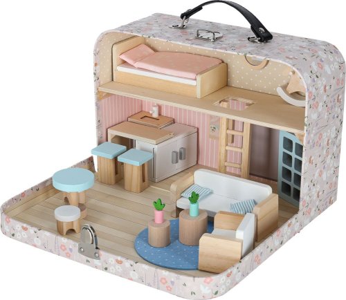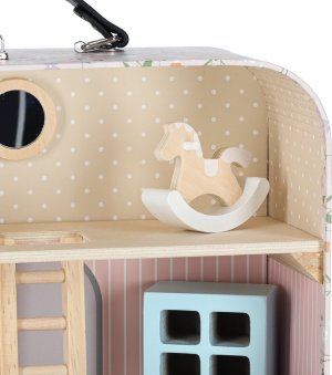 Díky praktickému kufříku s rukojetí si ho dítě může snadno vzít kamkoli s sebou. Po složení zabírá minimum místa, a po rozložení se promění v půvabnou dekoraci dětského pokoje. Víko kufříku tvoří součást domečku, který lze vybavit dřevěným nábytkem – podle fantazie ho lze zařídit jako byt, obchod nebo hotel pro zvířátka.