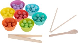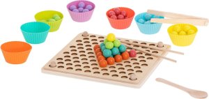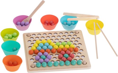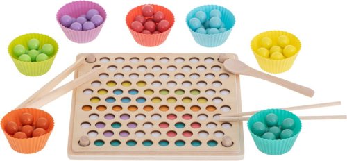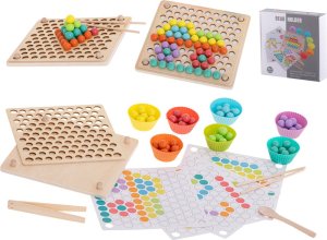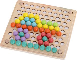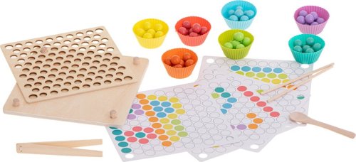 77 barevných kuliček (v 7 barvách) 7 barevných misek na kuličky dřevěný panel sestávající se z 2 částí 8 papírových předloh 2 hůlky pinzetu lžíci