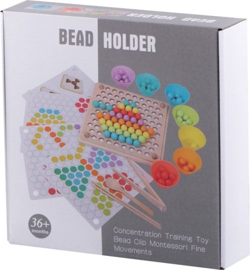 Sada se skládá z barevných dřevěných korálků, které se umísťují na dřevěné panely pomocí lžíce, pinzety nebo hůlek. Balení obsahuje: