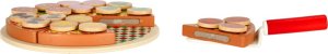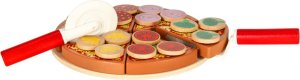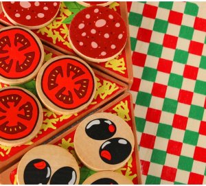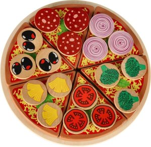 Sada pro zdobení vlastní pizzy. Hračka je vyrobena výhradně ze dřeva. Jednotlivé dílky pizzy lze spojovat pomocí přiloženého suchého zipu. Skvělá hračka, která jistě potěší malého kuchaře. Díky spojení dílků na suchý zip lze pizzu krájet přiloženým nožíkem. Hra pozitivně ovlivňuje rozvoj manuálních dovedností dítěte. Podporuje kreativní myšlení a tvořivost. Vaše dítě si bude moci pizzu ozdobit podle vlastní chuti.