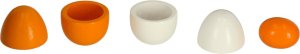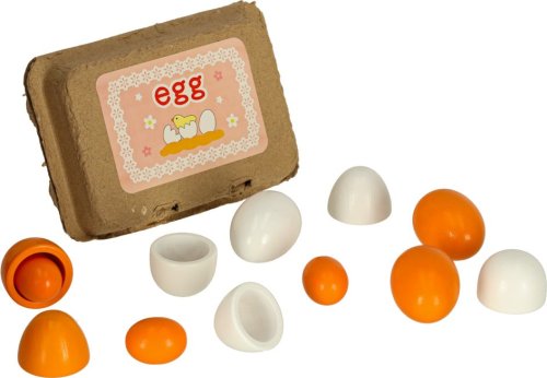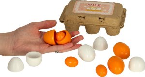 Sada obsahuje 6 vajíček, z nichž tři lze rozdělit na poloviny a vyjmout žloutek – díky tomu je hra ještě zábavnější a věrnější skutečnosti. Všechna vajíčka jsou uložena v praktickém papírovém obalu, který usnadňuje ukládání. Hračka rozvíjí jemnou motoriku, tvořivost a představivost dítěte a podporuje aktivní hru.