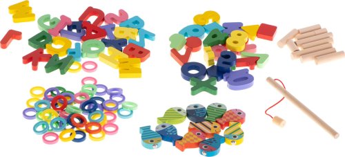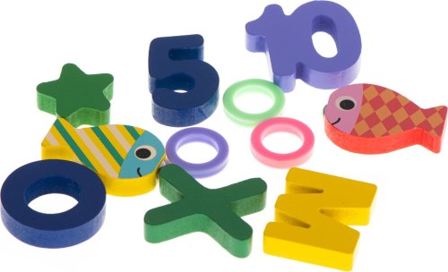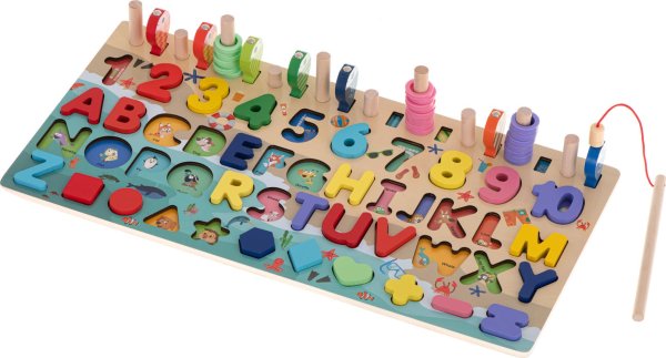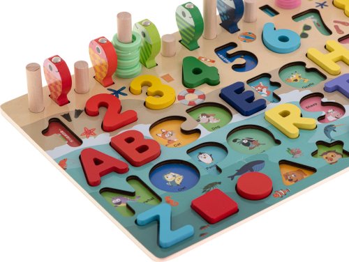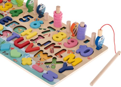 Přiřazujte geometrické tvary a čísla. Ideální pomůcka pro učení počítání. Hra rybolov - barevné rybky je třeba chytit pomocí rybářského prutu s magnetem. Podkladové obrázky s názvy v angličtině. 10 svislých kolíčků pro barevné kroužky odpovídající číslu stejné barvy. Výborně podněcuje představivost, podporuje kreativní myšlení a skvěle rozvíjí manuální dovednosti. Děti se učí zábavnou formou barvy, tvary, čísla, základy matematiky a anglická slovíčka. Všechny prvky mají pečlivě obroušené hrany.