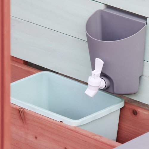 Vyrobeno z impregnovaného smrkového dřeva, praktická a nastavitelná stříška, lavičky k sezení, doplňky pro ještě větší zábavu – mlýnek, kohoutek, tabule a úložné boxy, jednoduché sestavení.