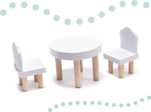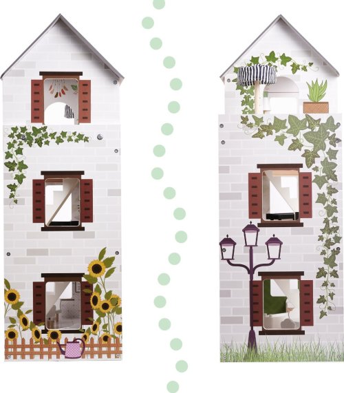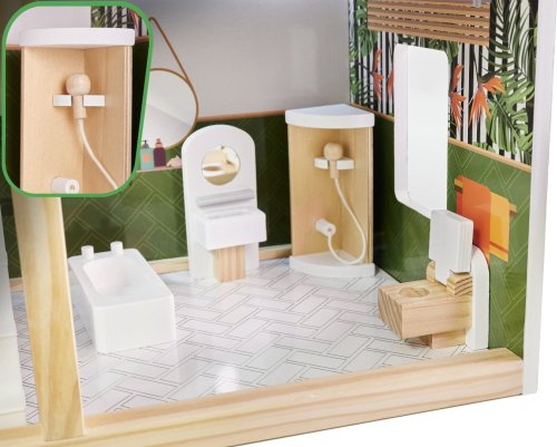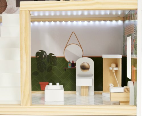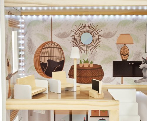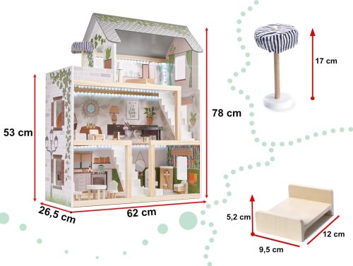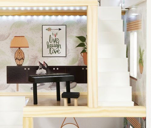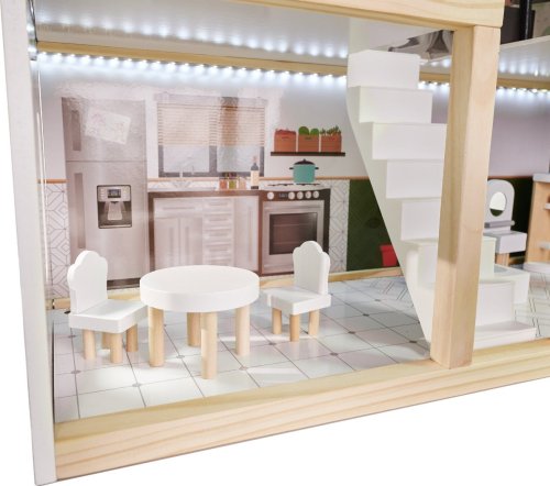 Moderní vzhled. Tři patra s prostornými pokoji (kuchyň, koupelna, obývací pokoj, ložnice) a terasou. Z patra do patra vede schodiště. Vybaven miniaturním nábytkem ze dřeva . Osvětlen pomocí LED pásků . Dřevěné části byly vyrobeny tak, aby se dětem při hře nedostaly do rukou třísky. Domeček zaručí nejen zábavu, ale bude i skvělou dekorací do dětského pokoje.