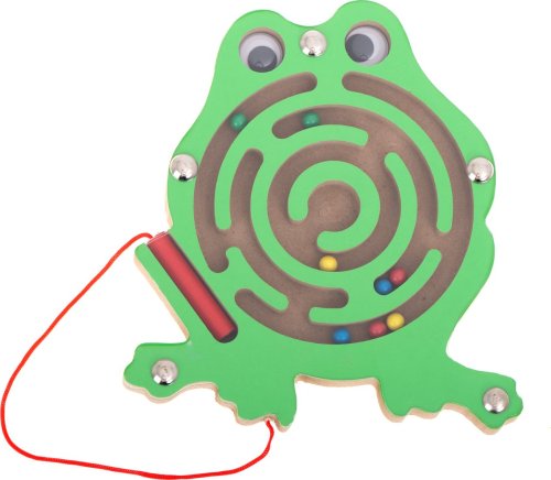 Magnetický labyrint Žába potěší každé dítě a vybízí ke hře. K žabce je připevněn magnetický stylus na provázku, se kterým se kuličky budou pohybovat. Navíc, aby byl úkol obtížnější, mohou být kuličky vedeny bludištěm otáčením žabky v různých směrech.