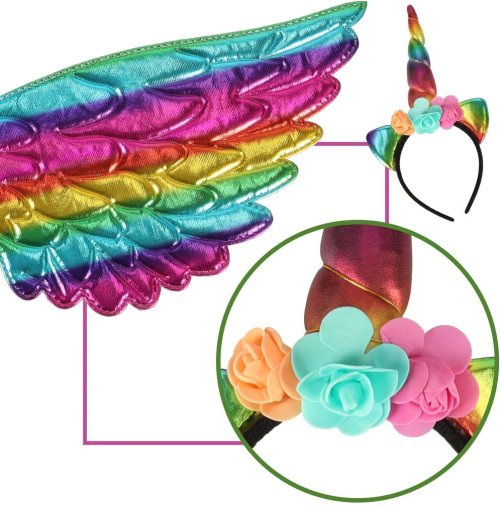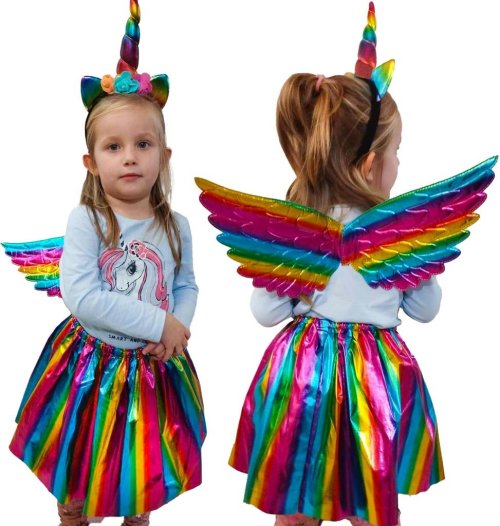 Balení obsahuje: duhovou sukni květinovou čelenku s jednorožším rohem duhová křídla