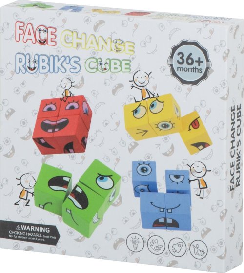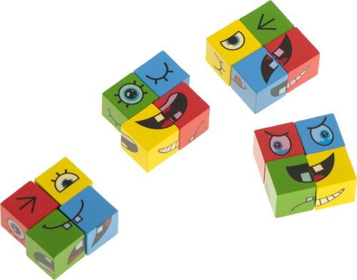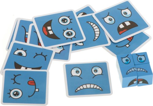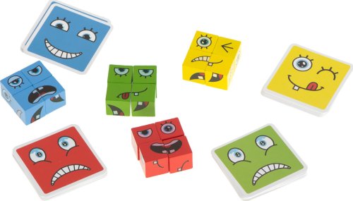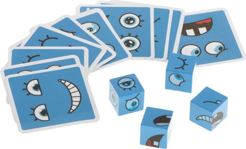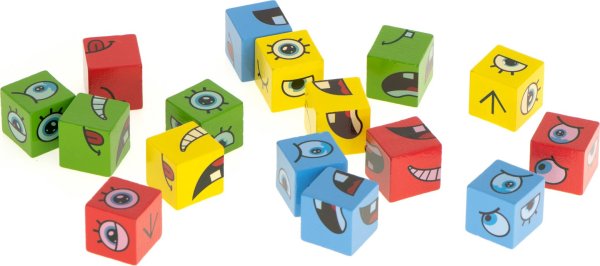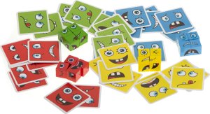 Pravidla hry: náhodně vyberte jednu z karet a vytvořte vyobrazený obličej co nejrychleji pomocí kostek. Barva kostek musí odpovídat barvě karty. Zdá se vám úkol snadný? Pozor, nenechte se zmást zdáním. Vyhrává ten, kdo sestaví 10 obličejů co nejrychleji. Sada obsahuje: 16 kostek ve čtyřech barvách, 64 karet s různými obličeji.