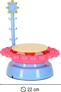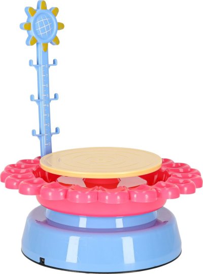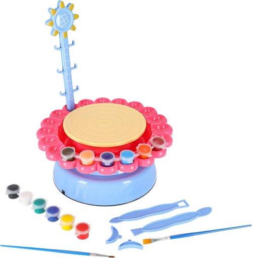 Kruh nabízí dvě rychlosti otáčení, takže je vhodný jak pro začátečníky, tak pro děti, které si už hrnčířství vyzkoušely. Díky zástěře a bohatému příslušenství mohou děti tvořit bez obav o své oblečení. Sada obsahuje vše potřebné k výrobě a zdobení hrnků, misek, květináčů či váziček – včetně barev, štětců a modelovacích nástrojů. Kruh lze napájet USB kabelem nebo 4 bateriemi LR20, takže zábava může pokračovat i venku. Balení obsahuje: hrnčířský kruh, 3 sáčky s hlínou (celkem 600 g), 12 barev, 2 štětce, 2 modelovací válečky, metr, USB kabel a zástěra.