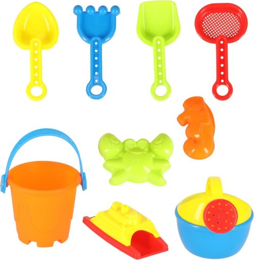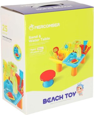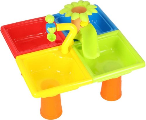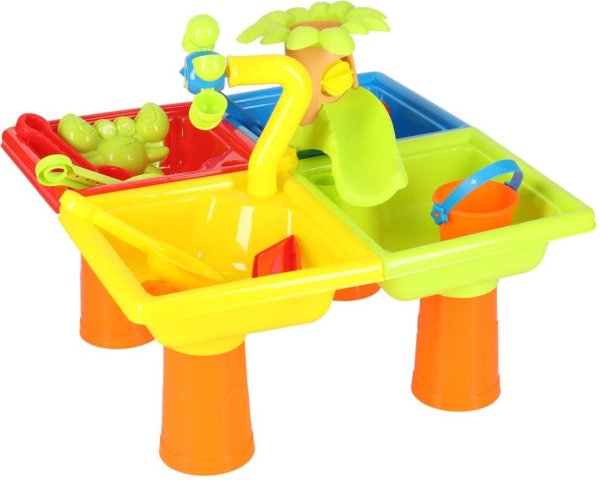 1x stůl + 1x stolička 1x mlýnek na vodu nebo písek 1x mlýnek se skluzavkou 2x lopatky, 1x hrábě, 1x sítko, 2x formičky 1x loď, 1x mini kbelík, 1x mini konvička na zalévání 1x spojka na stůl 1x návod k obsluze