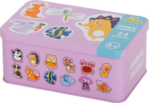 Na dílcích jsou anglické a čínské nápisy, které usnadní výuku jazyků. Smíchejte puzzle, otočte je lícem dolů a vytvoříte tak pexeso. Kovový box je praktický při cestování.