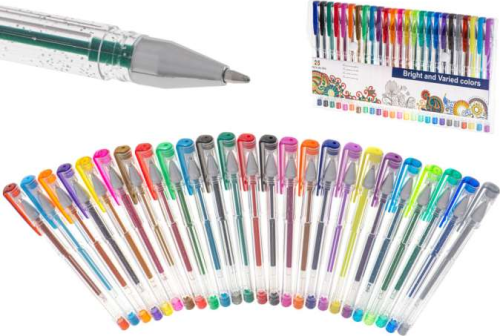 Bohatá sada 25 barevných gelových per. Balení obsahuje: 2 třpytivá pera, 7 metalická pera, 3 neonová pera, 3 ks per ve standardních barvách - černé, modré, červené. Délka pera: 15 cm.
