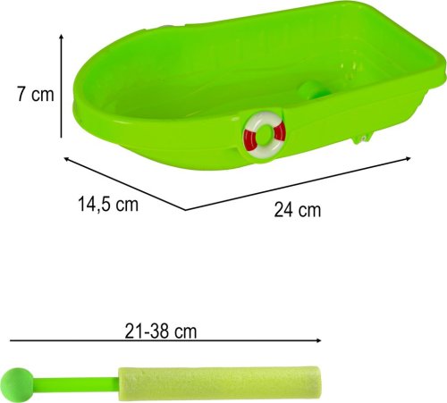 Rozměry vodní pistole: 21–38 cm × 3 cm Délka hrábí: 14,5 cm Rozměry loďky: 24 cm × 14,5 cm × 7 cm