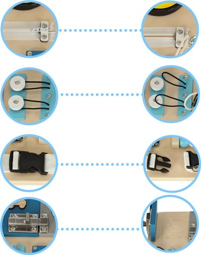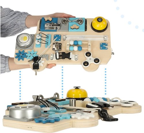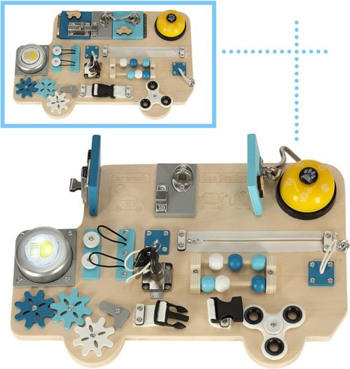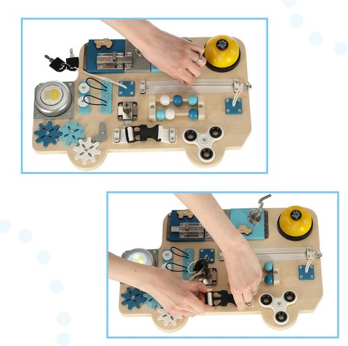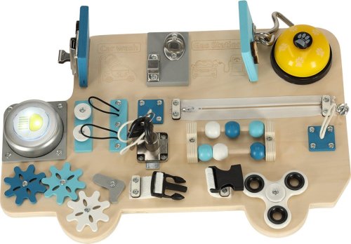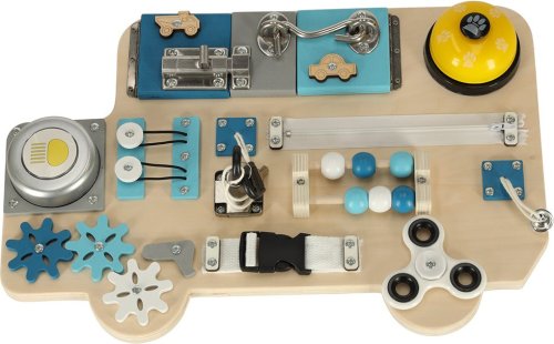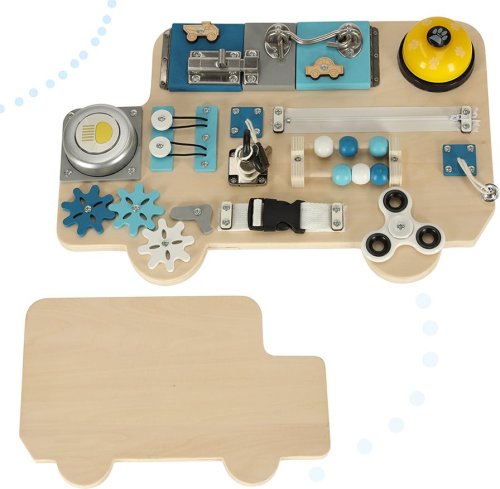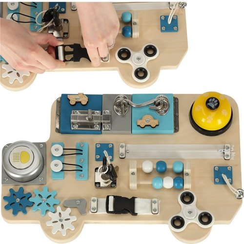 Manipulační tabule pro bezpečné hraní s každodenními potřebami (klíče, zipy) ze světa dospělých, pohyblivé prvky pro hru pomocí posouvání, stiskání, otevírání nebo otáčení, procvičování jemné motoriky podle principů Montessori, rozvíjení koordinace očí a rukou, manuálních a intelektuálních dovedností, děti musí samy přijít na fungování jednotlivých prvků, tabule má tvar autobusu, takže upoutá především malé fanoušky vozidel, jednotlivé prvky: lampička na baterie, spinner, ozubená kola, zvonek, 2x klíč, zámek na klíč, kovová závora, zip, zvonek na šňůrce, korálky jako na počítadle, 2x tvar autíčka, 2x kresba, hák na zavírání.