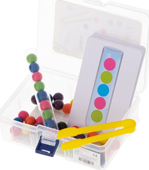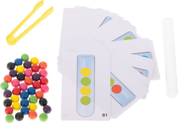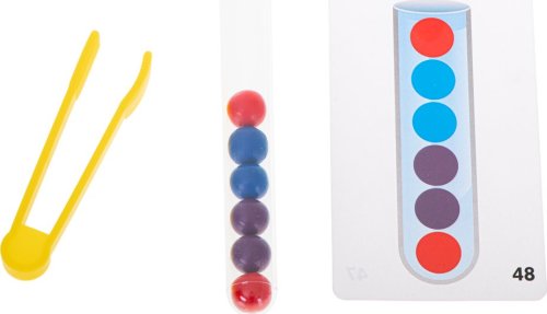 Cílem této jednoduché hry je roztřídit kuličky do zkumavky pomocí rukou nebo pinzety, která je součástí balení. Inspiraci poskytne 24 oboustranných karet se vzory, podle kterých děti uspořádají kuličky do zkumavky. Úkol se může zdát jednoduchý, ale zpočátku to bude jistě výzva. Použitím pinzety zlepšíte manuální dovednosti vašeho dítěte.