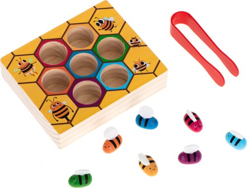 Cílem této jednoduché hry je roztřídit včelky pomocí pinzety do odpovídajících otvorů v plástvi. Použitím pinzety zlepšíte manuální dovednosti vašeho dítěte. Dřevěné včelky mají křídla z materiálu podobného plsti, který svou odlišnou texturou stimuluje u malých dětí hmat.