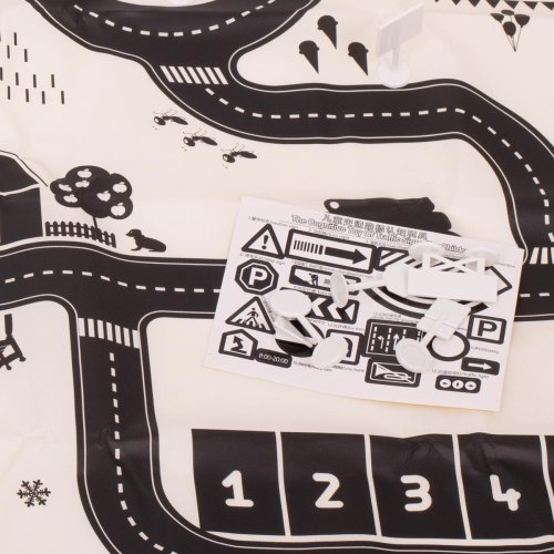 Vytvořte si vlastní město, umístěte značky dle vašeho přání, barva podložky: krémová, černá, hra na podložce bude skvělým úvodem do poznávání dopravních předpisů, voděodolná, velmi tenká a lehká, vhodná na výlety, snadno se čistí vlhkým hadříkem, před hraním nalepte samolepky na značky, snadné složení do kompaktních rozměrů.