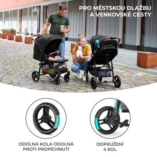 Odpružená kola Kočárek má odpružení 4 kol. Díky tomu si GRANDE PLUS poradí i s městským terénem – nerovnými chodníky nebo dlažebními kostkami. Kola není třeba nafukovat a jsou také neprorazitelná. Přední kola jsou otočná o 360 stupňů a mají aretaci pro jízdu rovně.