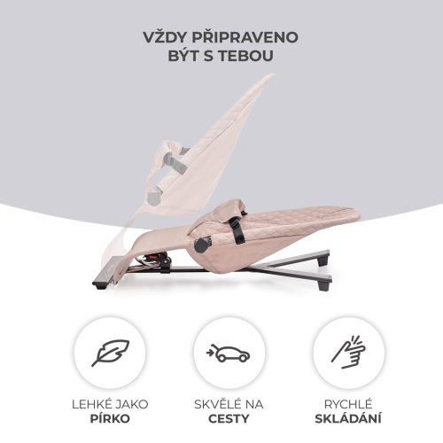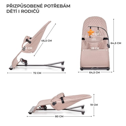 Lehátko MIMI přináší čistý minimalismus, uzavřený v překrásné formě. Je to bezpečí, pohodlí a elegance v jednom. Pomůže zklidnit Vaše dítě i během velmi neklidných dnů a zároveň jej nebude příliš stimulovat. A když si bude chtít hrát – bude mít k dispozici 2 závěsné hračky. Žádná světýlka ani hlasité zvuky. Díky třístupňovému nastavení opěradla lehátko snadno přizpůsobíte potřebám dítěte. Ideálně uzpůsobená sedačka z příjemné látky rovnoměrně rozkládá váhu dítěte a podporuje přirozenou polohu během odpočinku.