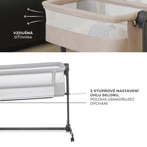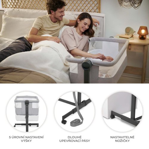 Ideální přizpůsobení Díky plynulému a snadnému nastavení výšky postýlky lze přistýlku jednoduše přizpůsobit výšce rodičovské postele. Nastavte ji na jednu z 5 úrovní, seřiďte nožičky tak, aby přistýlka těsně přiléhala k posteli, a připevněte ji speciálními popruhy, abyste vytvořili bezpečný prostor pro spaní vašeho dítěte. Zachováte si prostor pro sebe a zajistíte si hygienu spánku, ale zároveň budete mít své dítě na dosah ruky.