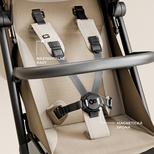 Pohodlné bezpečnostní pásy Magnetické, pětibodové bezpečnostní pásy zaručují bezpečnost a snadné používání - zapnutí a odepnutí trvá jen chvíli. Bezpečnostní pás je také vybaven pohodlným výškovým nastavením, které vám umožní přizpůsobit jej výšce dítěte nebo tloušťce oblečení, aniž byste jej museli znovu zapínat. Otočné madlo, které lze z obou stran odebrat, navíc usnadňuje nakládání a vyjímání dítěte z kočárku a poskytuje rodičům maximální komfort.