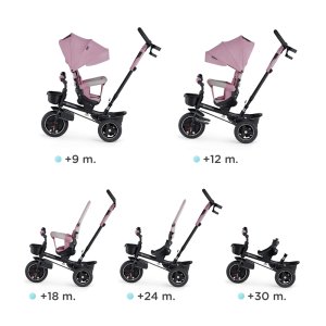 Tříkolka má sedadlo otočné o 360°, které lze nastavit čelem k rodiči, nebo čelem po směru jízdy – dítě se bude cítit jistěji, když Vás bude mít zpočátku na dohled. Díky hluboké, nastavitelné stříšce z voděodolného materiálu s filtrem UPF50+ dítě neohrozí vítr nebo mrholení – stejně jako ve sportovním kočárku! Za komfort jízdy odpovídá pohodlné sedadlo s měkkým potahem a vysokým opěradlem, které při dobývání světa poskytuje dětským zádům optimální oporu. Tříkolka je vybavena 3-bodovými bezpečnostními pásy a odepínacím madlem, které lze demontovat, když je dítě připraveno na samostatnou jízdu.