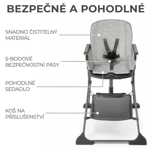 Nejvyšší kvalita FOLDEE má velké sedadlo, které je vyrobeno ze snadno omyvatelného materiálu. Snadno z něj odstraníte i ty nejodolnější skvrny od jídla. Židlička je bezpečná: má 5-bodové nastavitelné pásy, které lze v případě potřeby odejmout a vyprat. Pod sedadlem je košík na drobnosti, jako jsou vlhčené ubrousky nebo náhradní bryndáček.
