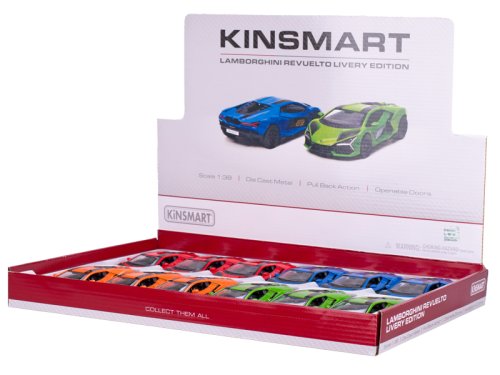 Kinsmart Lamborghini Revuelto 13 cm 1:38 kov zpětný chod - mix barev (oranžová, modrá, zelená, červená)