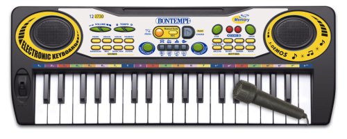 Elektronické klávesy s mikrofonem – 37 midi kláves (C-C). Přednastaveno 8 melodií, 8 rytmů, 5 přednastavených nahraných písní, 4 přednastavené zvuky bubnů, 4 rytmické variace. Můžete nahrávat a přehrávat různé tóny, předprogramovatelný rytmus. Nastavení hlasitosti zvuku, stop, tempo +/-. Efekty – ozvěna, vibrato,sustain. Zástrčka hlavní adaptér není součásí. zástrčka pro mikrofon je součástí. Provoz na baterie 4R6AA1,5 V nejsu součástí. Rozměry 42,5×16×6 cm.