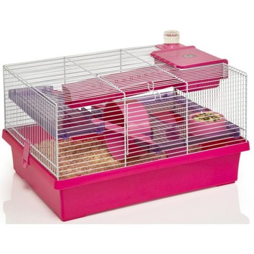 Plastová vícepatrová klec pro syrské křečky a křečíky s vybavením. Je vhodná také pro většinu myší a křečíků od 6 – 8 týdnů věku. Drátěná klec Pico, poskytuje různé prolézačky a skrýše. Snadný přístup do zavěšeného domečku a plnění napáječky z vnější části klece. Velmi jednoduché čištění, všechny části v prostoru jsou ke kleci připevněny, zásobník může být odebrán a vyčištěn. Boční a horní přístup do klece. Vybavení: napáječka, miska na krmení, domeček, schodiště a tiché kolečko na cvičení. Rozměry: 50 × 36 × 31 cm Rozteč mezi dráty: 1 cm Barva: růžová/fialová