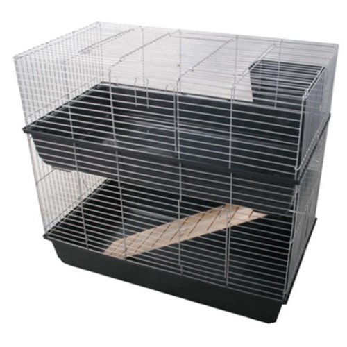 Prostorná dvoupodlažní klec pro králíky a morčata. Patra jsou propojena dřevěným žebříkem. Přístup do obou částí klece předními dvířky, v horní části prostornější dvířka ve stropě. Součástí vybavení klece je zásobník na seno. Rozměry: 100 x 56 cm, výška 92 cm
