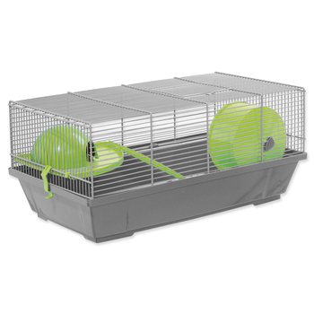 Klec pro myši a jiná malá zvířata s výbavou. Součástí je kolečko na běhání, patro s žebříkem a domeček.